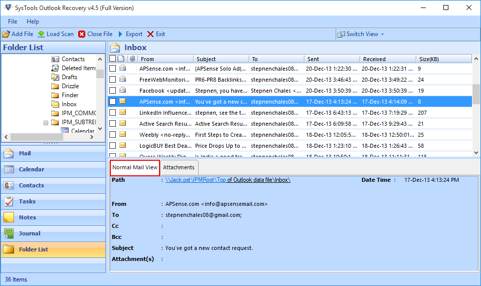 After the scanning od the PST File is done , user has the option to preview emails and other elements of the PST file that are recovered by the software.